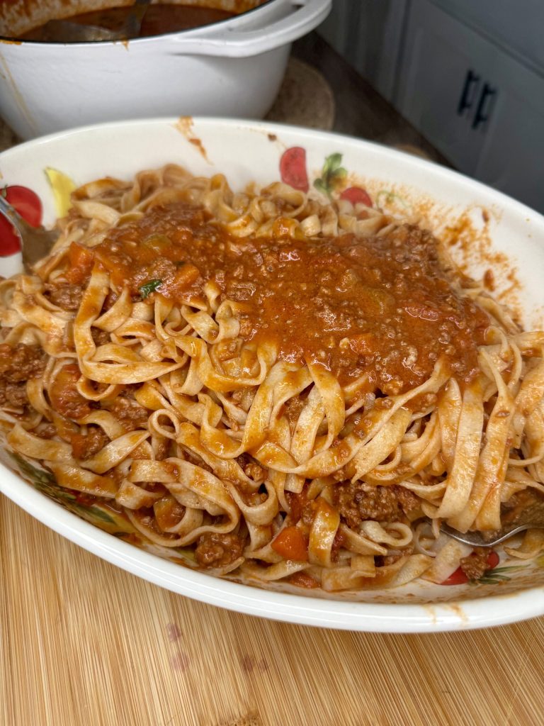 Serve the bolognese over the cooked pasta, toss it well, and garnish with some grated pecorino romano. Enjoy!
