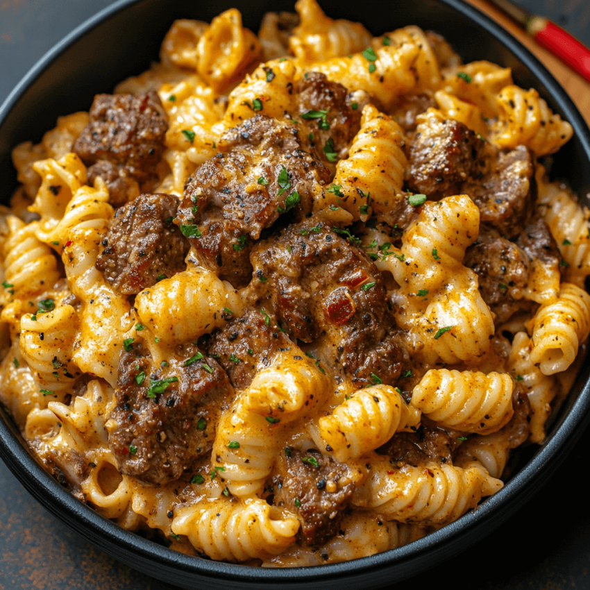 Stir in the grated Parmesan. Let the sauce simmer for another 2–3 minutes until it thickens slightly. Keep stirring so it stays smooth. - Combine pasta and steak