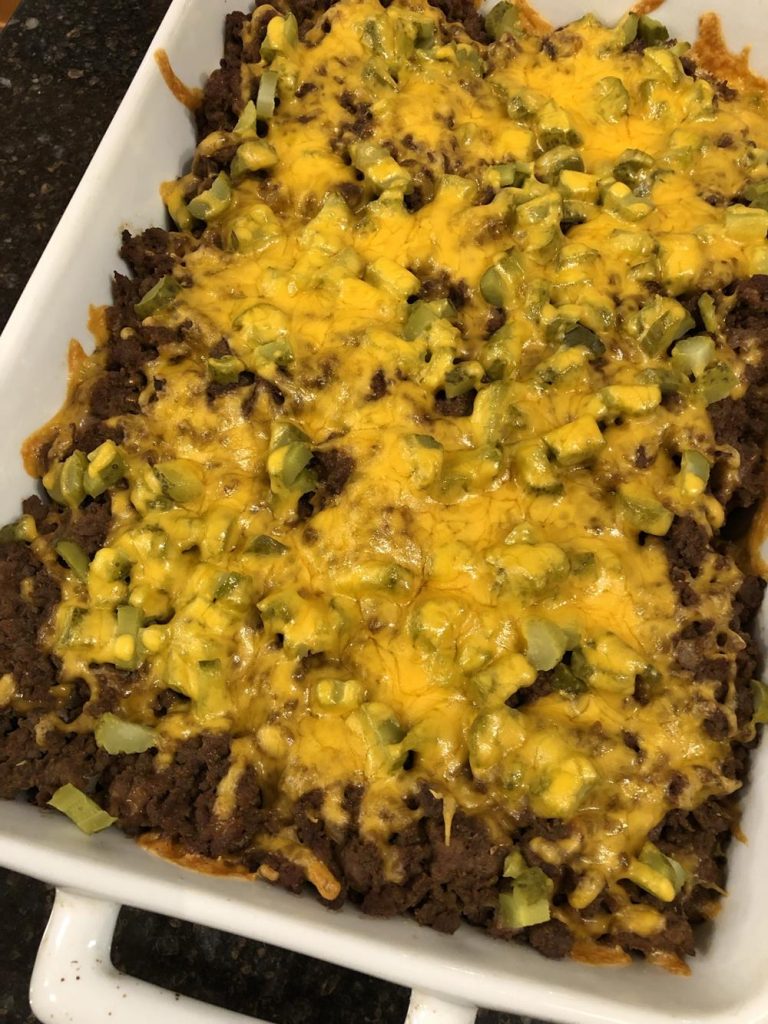 Our Keto Cheeseburger Casserole bake is loaded with bacon, pickles, mustard, and cheddar cheese – just like a hamburger but without the bun, a delicious low carb dinner.